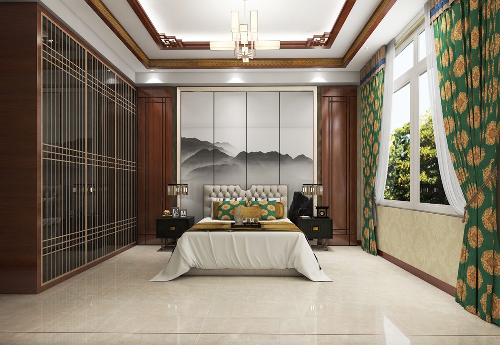 主卧床背景仍利用木色为主构架融会贯通,再加以富有意境的山水壁画作为更深层的点缀,让人们在整个空间里感受传统文化带来的熏陶与动感,生命也变得温润充盈,富有韵味。