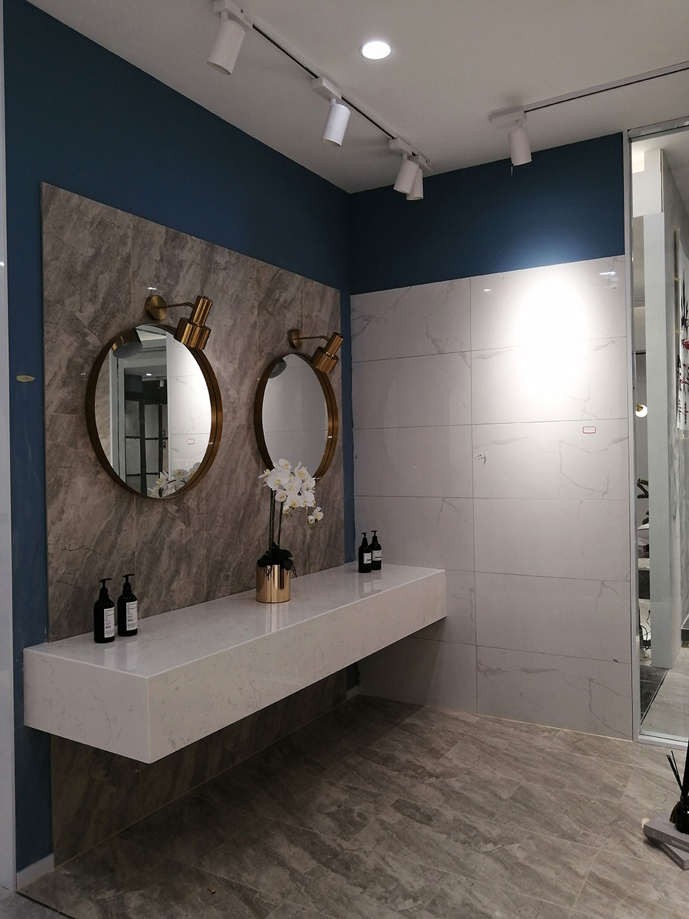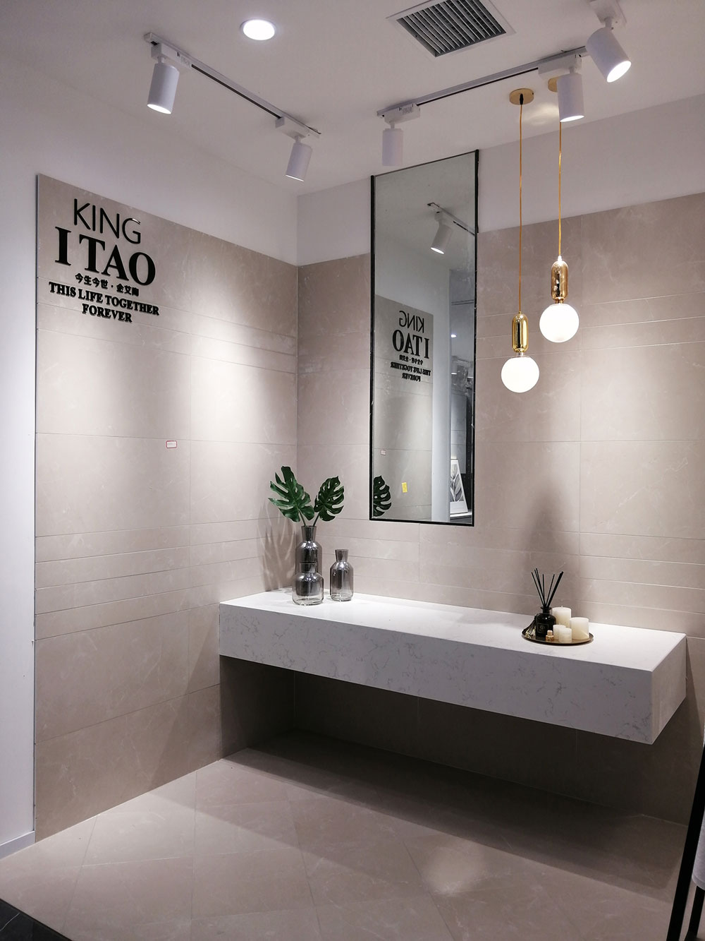 选用的是600*1200规格的通体大理石达曼深咖KTB9818/鱼肚白KAM61213,墙面的深咖色与地面的白色相呼应,营造了一种现代极简的空间感,台面上的白色加深咖色的相框让整个空间的底层白色与上层深咖色过渡的非常自然,使整个空间显得十分统一。