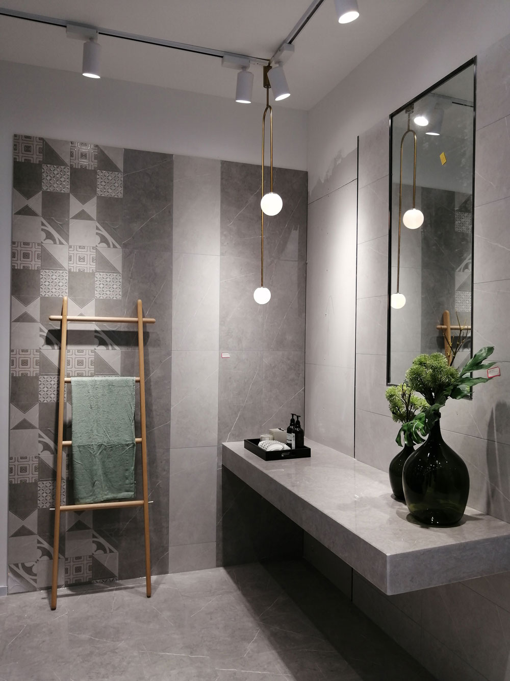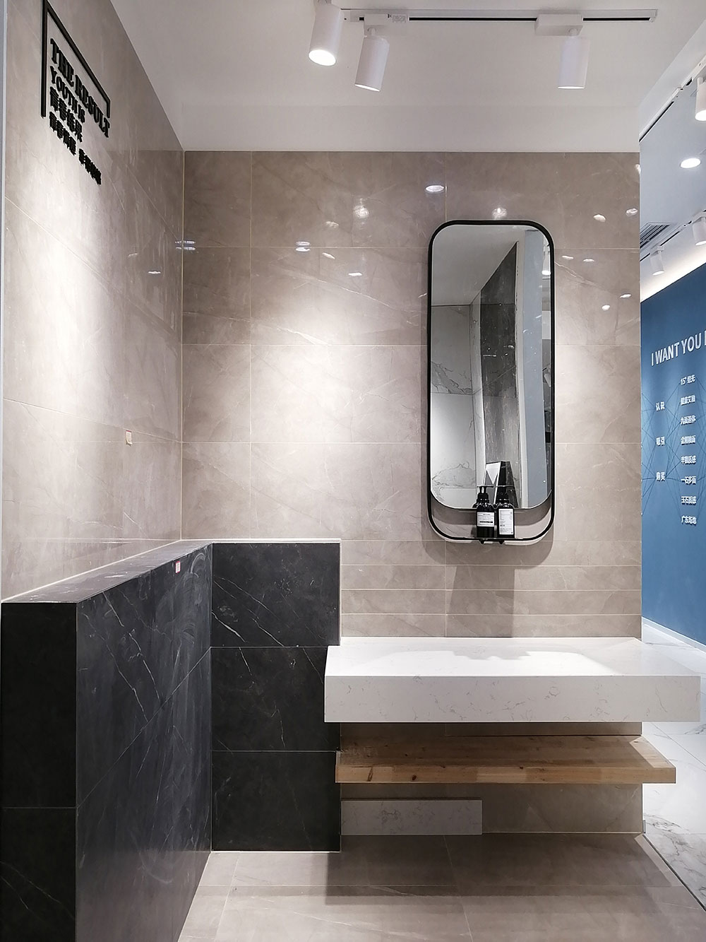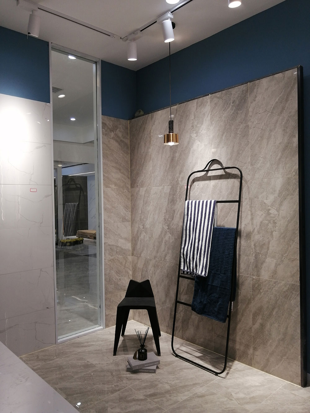 由通体大理石玛雅灰KTA8301铺贴,整个空间以灰色作为主色调,灰色是最近家装最流行的颜色,自带高贵与品味,优雅沉着,砖面纹理大胆粗犷,营造沉稳大气的空间氛围,墙面与地面选用同款产品,营造空间协调统一的空间。