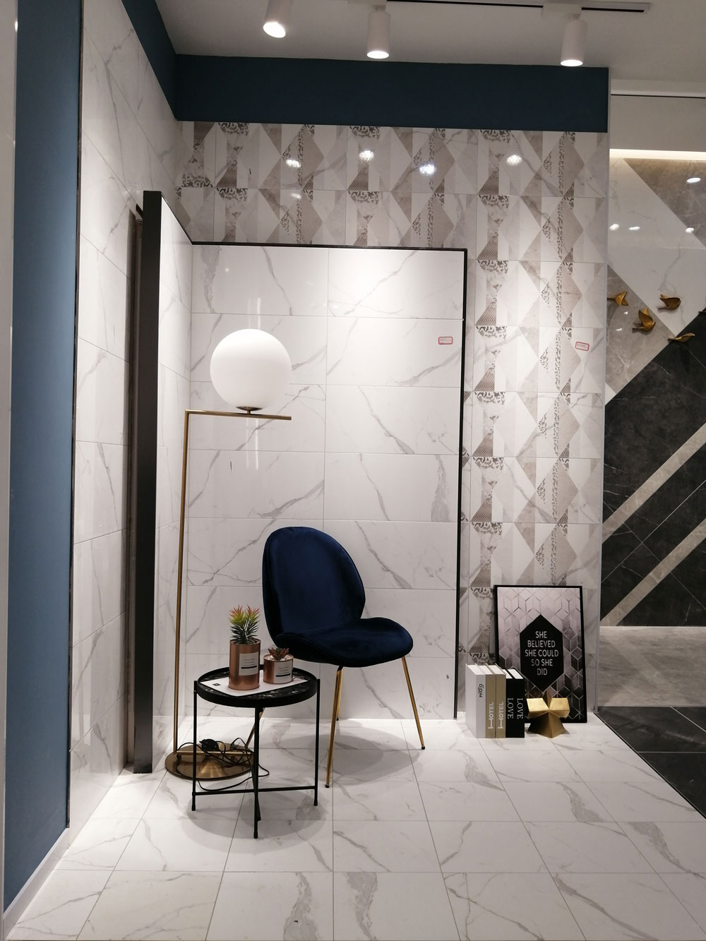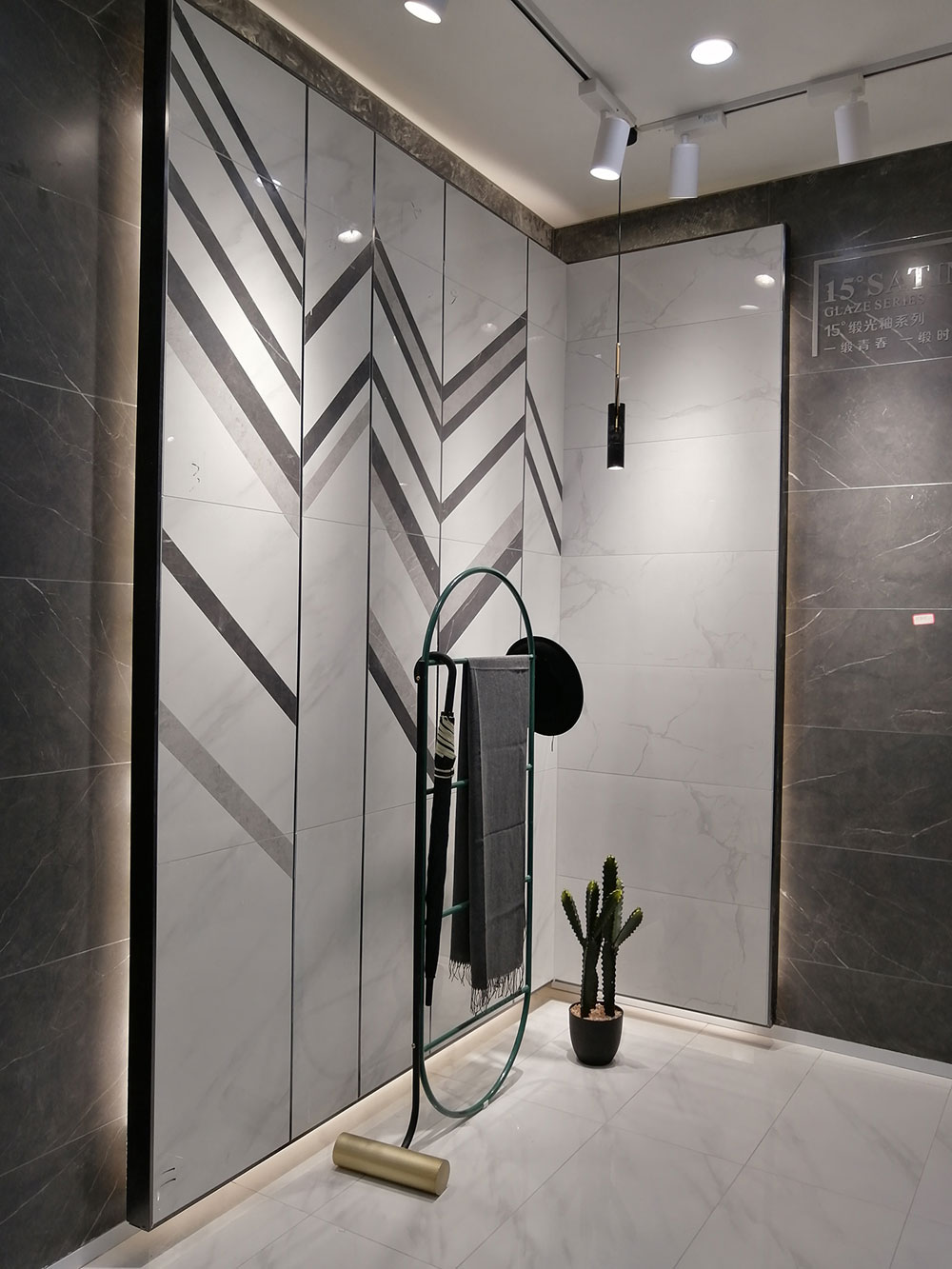 由通体大理石维纳斯灰KT9831切割后通铺,空间营造的是轻奢的感觉,整个空间大面积使用维纳斯灰,灰色是一种无极色,与黑色相搭配让整个空间体现出简单、奢华。整个空间采用了平铺,素雅的平铺更加突出砖本身的纹理与质感,返璞归真,通过细节体现品味和奢华。