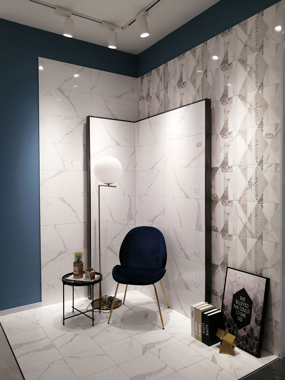 墙面是由艾釉石KYP8101水刀切割铺贴,黑白灰对比强烈,空间层次分明,区别于传统的直铺,彰显年轻人个性、大胆的需求。白色作为主色调,最有包容性的颜色,可以和任何颜色进行搭配,在这个空间,白色与灰色、黑色让整个空间富有艺术感和时尚感。