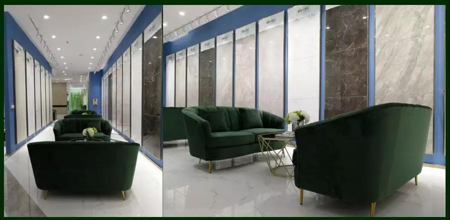 800*800样板展示区,以色彩置为参照圆点,延伸出了以雪白而略带灰度的空间基底,带有肌理感的瓷砖样板,用颜色和亮度的不同,区分空间的层次;结构线条和香槟金钢条阵列相间,对于金属纽带的回应,穿插在空间的每一个小细节中;