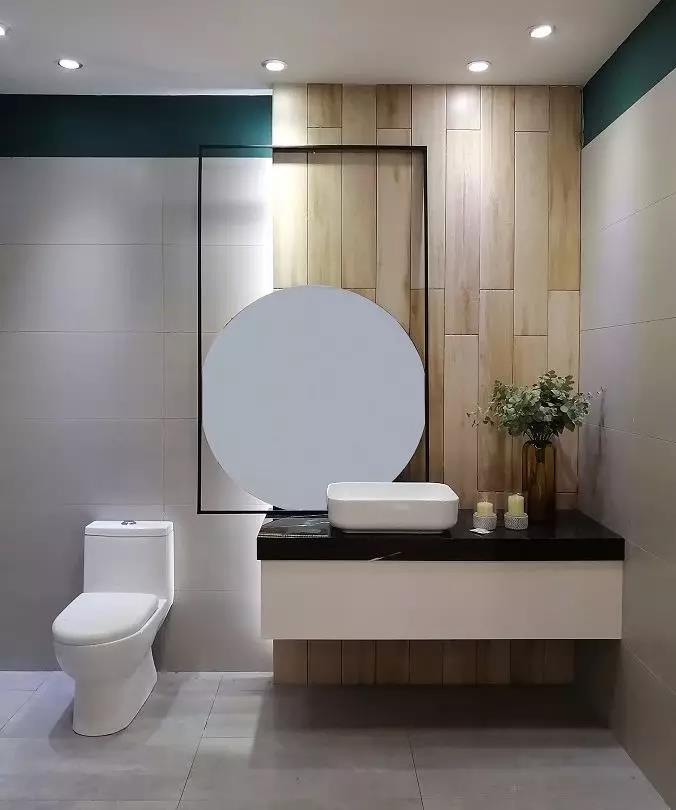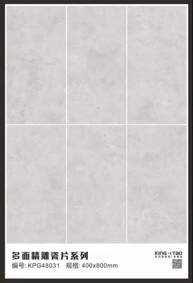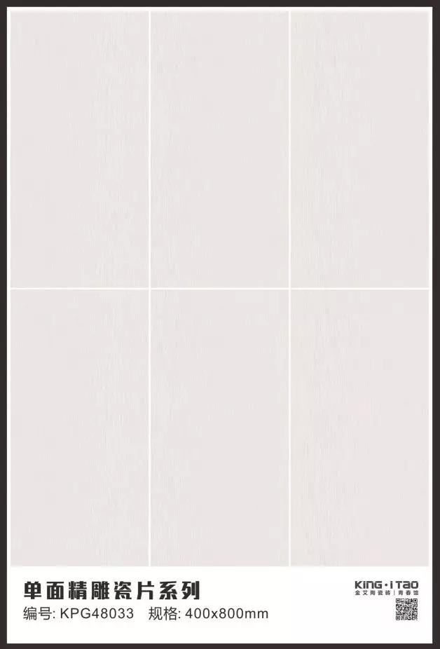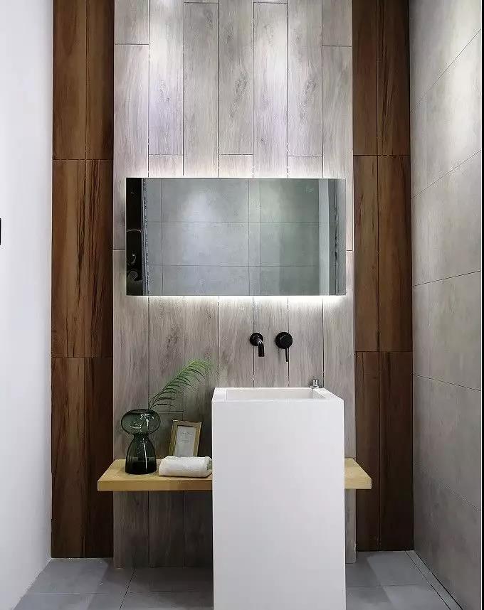 KPG48035是一款400*800规格的单面精雕干粒瓷片,洗手台背景采用了150*900规格木纹砖KFG159C12,营造出了木质的柔和,中和了灰色调的冷清,给卫生间带来了轻松的氛围。48035是一款采用精雕干粒工艺的瓷片,通过精雕釉和干粒让瓷片有凹凸的条状布纹立体感,让墙面更有空间感。