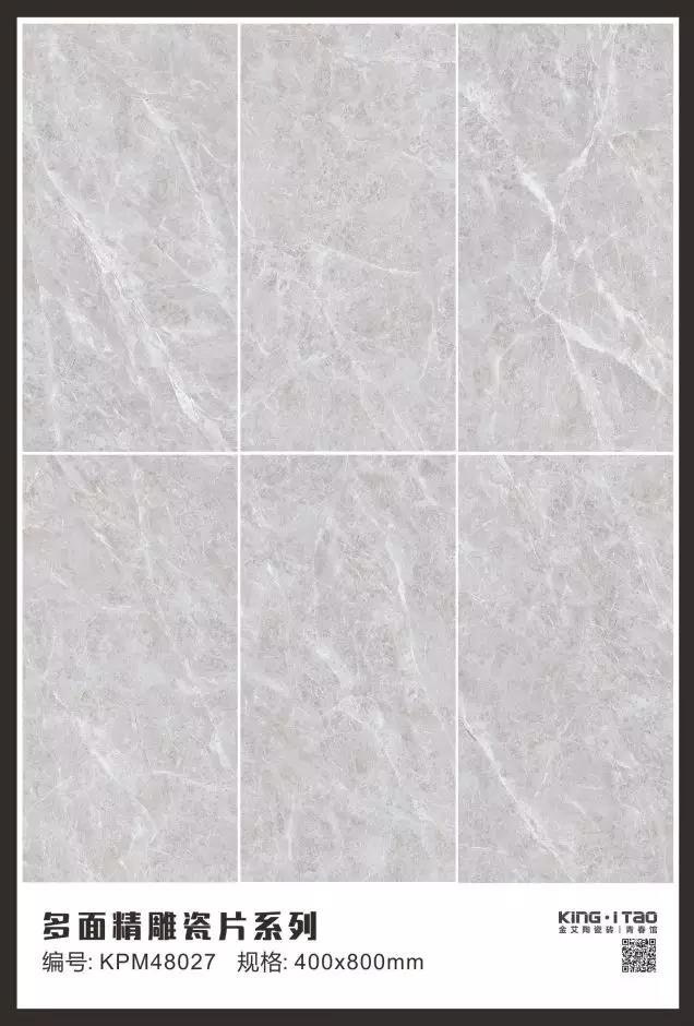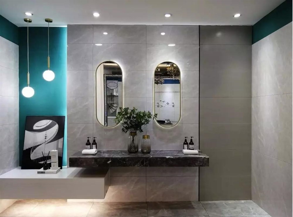 KPM48027是一款400*800规格喷墨亮光面的瓷片,高清晰多面文件,让你的卫生间墙面不再单调,浅灰色主调加大理石流纹,营造出时尚而优雅的空间美感。地面选用了15°缎光釉的KFD8813,更大更深的灰色大理石纹理让空间沉稳,设计师别出心裁的把地砖切成了400*800规格,和墙面相映成趣,浑然一体。