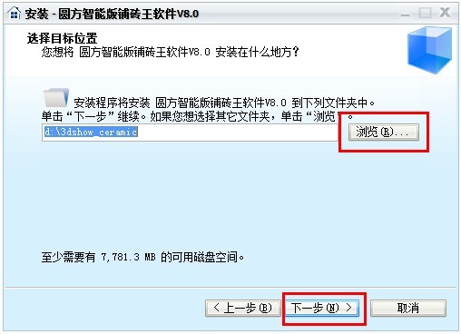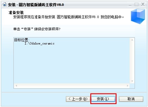 例如:假设要选择I盘,点击“浏览”,选择I盘(安装完毕后会在I盘生成3dshow_ceramic文件夹,软件的所有文件都保存在这里)