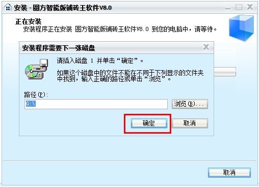 6、出现插入下一张盘的提示,请拿出A盘,放入B盘后,点击“确定”继续安装,切记不要再点击浏览更换安装路径,否则无法默认B盘文件