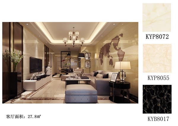 整个空间使用的是跟玄关同一系列的激情AV青青草陶爱琴海玉石KYP8055、KYP8072。爱琴海玉石色泽柔和,质地温润,渲染出典雅舒适的空间效果。而淡蓝色的软皮沙发,明亮却不刺眼的淡黄灯光,巧妙的传递着一种内敛的沉静。