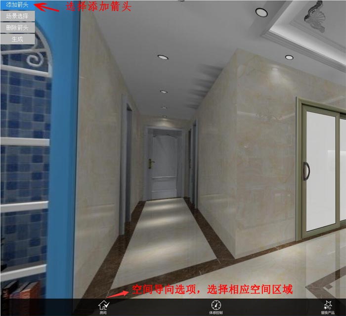 8.2、添加进入其他房间箭头后,进入场景选择选择相应的场景(场景需要跟箭头选择的空间保持一致)。