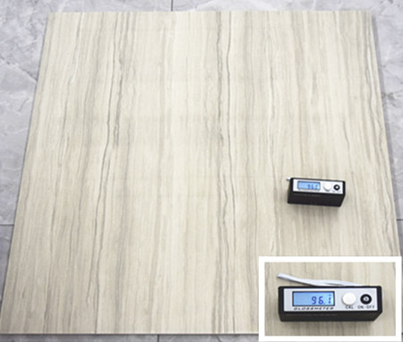 测评瓷砖必不可少的一项环节就是光泽度的测试,测评人员使用专业的光泽度仪,在瓷砖表面移动不同的位置测试,最后结果为多个位置光泽度的平均值。测试结果为96.1度,光泽度可以说是让人意想不到的好。