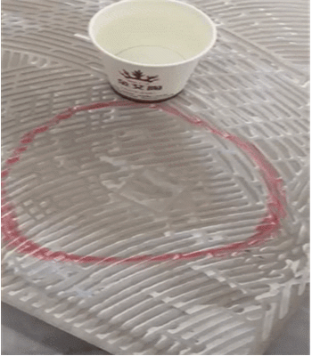为了检测这款瓷砖是否够防滑,测评人员将瓷砖倾斜放置,并在瓷砖表面洒满水,并将装满水的纸杯放置在瓷砖表面,静候几分钟,纸杯在瓷砖表面并没有出现滑行现象,说明这款瓷砖的防滑性能极好。