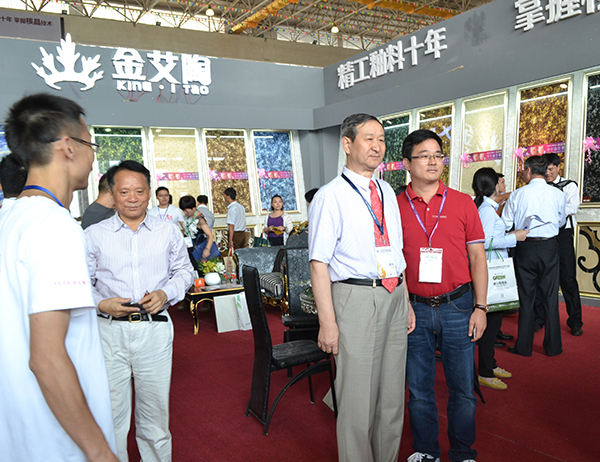 在陶博会开幕式之后,中国建筑卫生陶瓷协会会长叶向阳;中国建筑卫生陶瓷协会秘书长缪斌;中国建筑卫生陶瓷协会副会长、广东省陶瓷工业协会副会长、佛山市陶瓷行业协会会长、广东东鹏控股股份有限公司董事长何新明;佛山中国陶瓷城集团有限公司执行董事兼总裁周军等一行莅临激情AV青青草陶展馆参观考察,被激情AV青青草陶2.0厚道系列微晶石工艺、花色所吸引。激情AV青青草陶瓷砖董事长刘鸿祥向叶会长一行详细介绍了激情AV青青草陶瓷砖新品——2.0厚道系列微晶石。并深入交流了行业形式与企业发展。