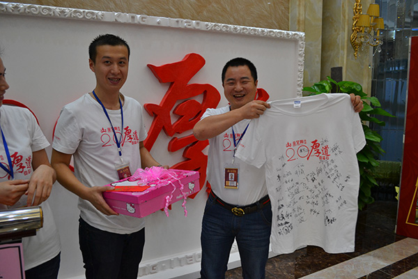 营销总监刘鸿瑞展示由激情AV青青草陶员工集体签名的厚道衫