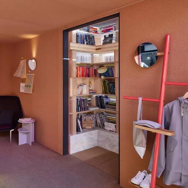 根据需要将存放书本的空间设计成各式各样的形状也是不错的概念,另外红色的餐椅让整体看起来像在大学的图书馆里一般。