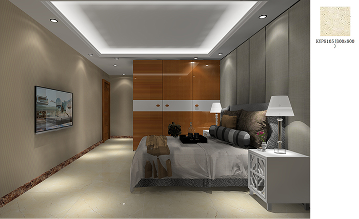 客厅:浅色调为主,背景墙选用淡黄色大砖铺贴,沙发选择简易灰色布艺沙发,整体现代感十足。