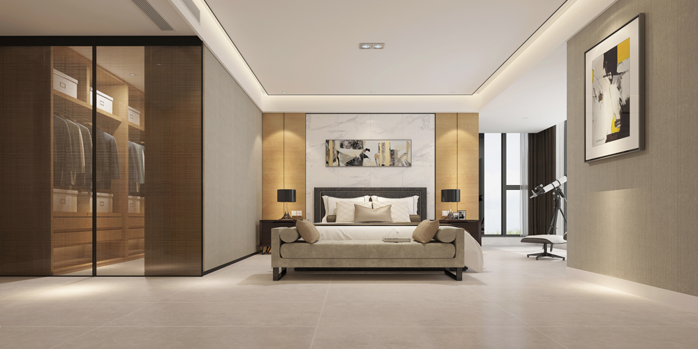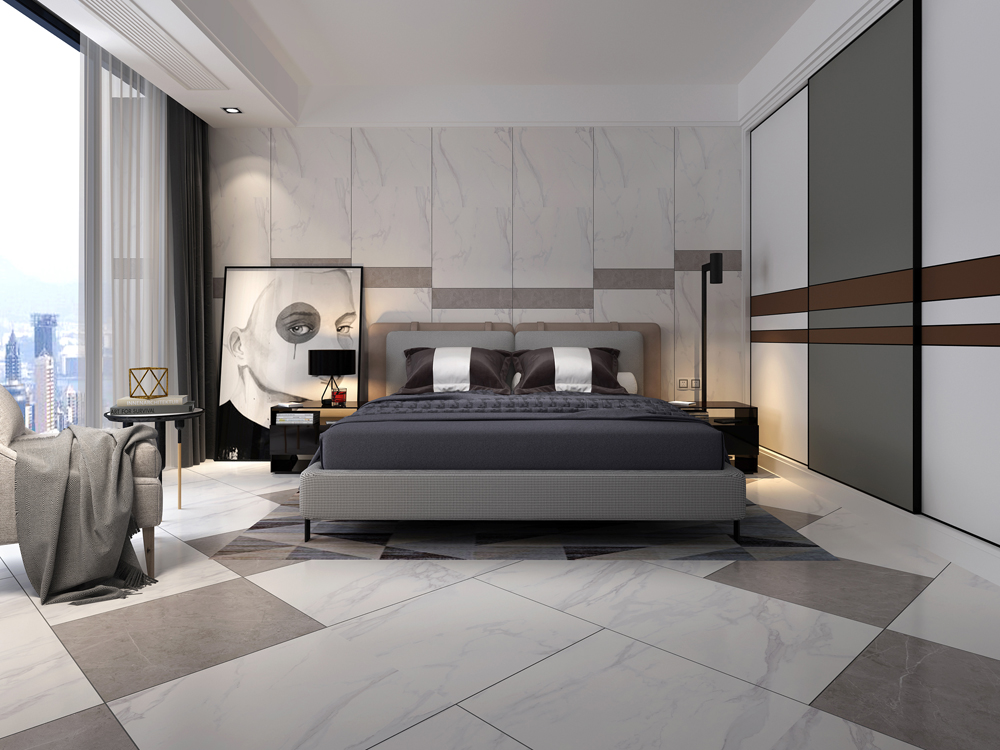 (15°缎光釉KFD8808)主卧室依然延续冷淡的灰色基调,以简洁舒适为主,营造出安静舒心的睡眠环境。
