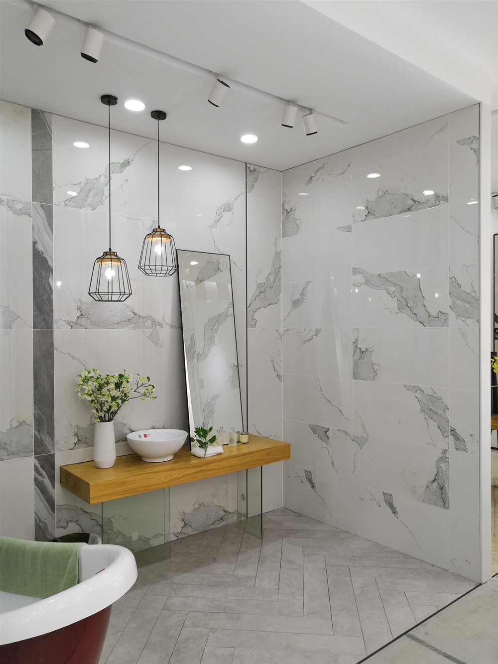 这是一个经典的亮光与柔光,深与浅的搭配,砖面纹路大气磅礴,矩形的浴室镜与墙面的竖形铺贴方式互相融合,你中有我我中有你,黑金钛收边条与线条感丰富的吊灯互相衬托,相得益彰,整个空间营造出轻奢感!