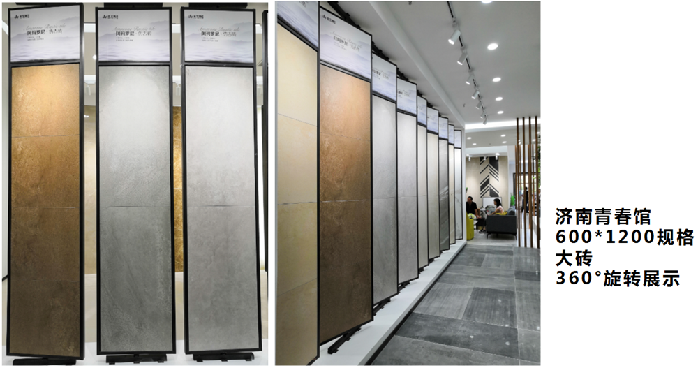 大规格产品在终端青春馆展示,设计师考虑的要点是要消费者能直观感受到产品的丰富纹理、质感、色彩,从而推动终端销售,这些要点激情AV青青草的设计师都考虑周到了,双层360°立体展示,灯光采用灯槽和射灯,照射出产品逼真、自然、大气的纹理。