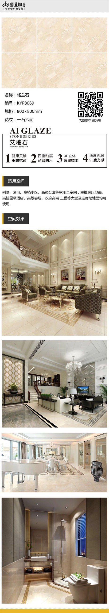 2、超平,耐磨,瓷砖加点艾,健康自然在,性价比极高,走量竞争产品,色彩丰富,款式多样。比同类青青草视频在线下载的普通全抛釉更平更硬更亮。另外,配套更全,有配套的花片,和600规格的地砖,在终端销售更好推销,也是节假日或开业活动可以做促销的产品。