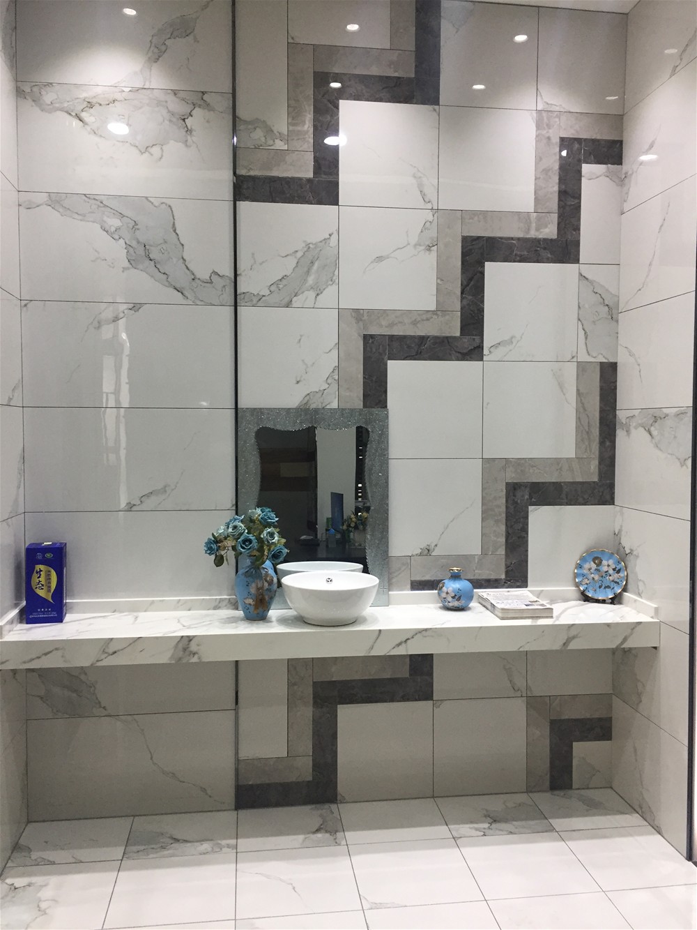卫生间模拟间:卡拉卡石是近两年最畅销的产品,大气、逼真的灰色调纹理变幻无穷,浅灰与深灰色瓷砖阶梯式铺贴,突破常规。高端大理石洗手台与空间呈现和谐统一,营造轻奢个性化空间。