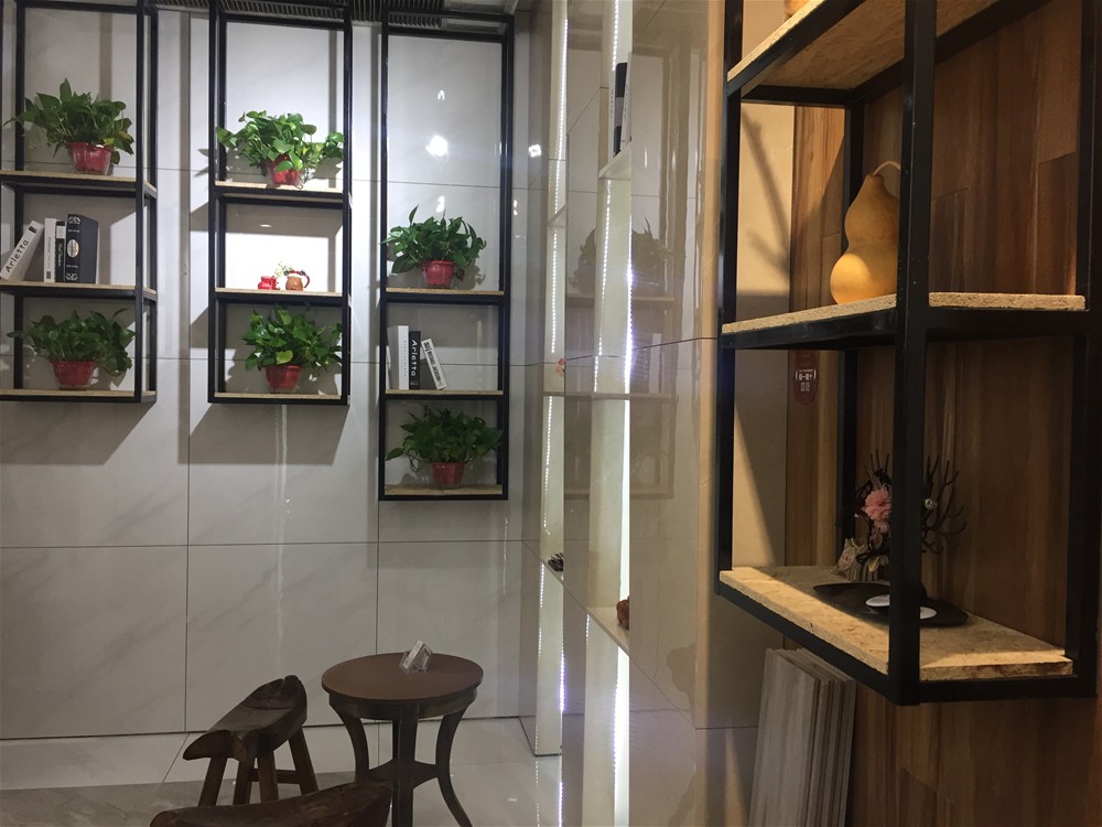 洽谈区:花砖与纹理相对简单的米黄色瓷砖搭配,个性又情调十足。绿色植物给空间增添生机。